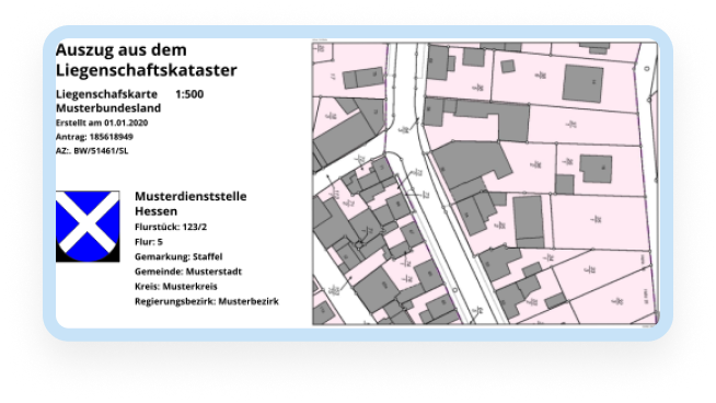 Die Flurkarte bzw. Liegenschaftskarte / Katasterkarte benötigen Sie insbesondere dann, wenn es um den Kauf oder Verkauf einer Immobilie geht. Sie stellt die Grundstücke und Gebäude eines Gebietes dar, weshalb sie vor allem für Interessenten eines Objektes von Bedeutung ist. Sie wird in den Maßstäben 1:500, 1:1.000 und in ländlichen Gebieten 1:2.000 geführt.