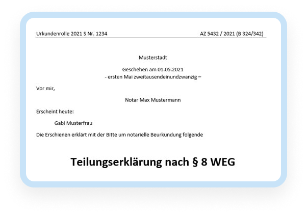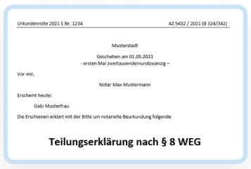 Die Teilungserklärung regelt die Aufteilung einer Immobilie, sowie Rechte und Pflichten der jeweiligen Wohnungseigentümer. Dies kann z.B. bei einem Mehrfamilienhaus die Aufteilung von Wohnungen, Kellerabteilen und KFZ Stellplätzen sein, sowie die Definition von gemeinschaftlich genutzten Flächen sein.