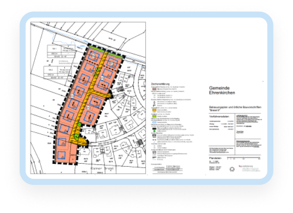 Der Bebauungsplan (auch B-Plan genannt) wird aus den übergeordneten Flächennutzungsplänen der Gemeinde heraus entwickelt und regelt die mögliche Nutzungsart und Bebauung von Grundstücken. Bebauungspläne weisen aus, welche Grünflächen freigehalten werden müssen, wie tief ein Grundstück bebaut werden darf und wie viele Geschosse gebaut werden dürfen bzw. erlaubt sind. Es gibt hier eine Vielzahl von Regelungen.