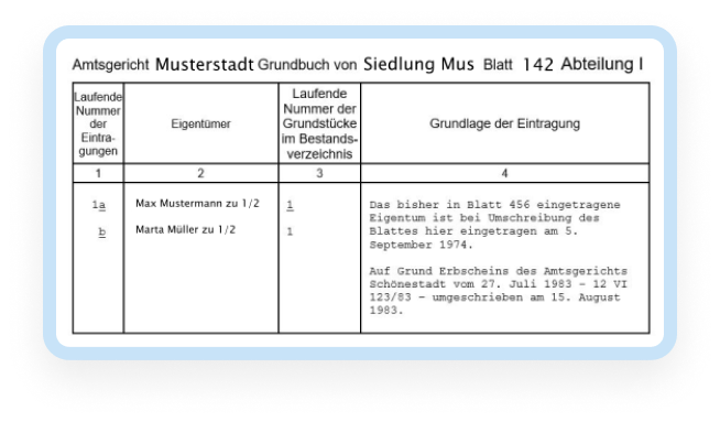 ✓ Abteilung I: Eigentümer: In dieser Abteilung werden die Eigentumsverhältnisse eingetragen. Hier sind der Name des Eigentümers sowie der Grund und das Datum der Eintragung vermerkt. Gründe können beispielsweise Erbe, Auflassung oder Zwangsversteigerung sein.