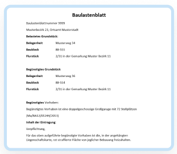 Im Baulastenverzeichnis ist aufgeführt, welche Baulasten auf einem bestimmten Grundstück liegen. Beisielsweise die Duldung eines KFZ-Stellplatzes für ein Nachbargrundstück oder zwei Grundstücke gelten baurechtlich als ein Grundstück, weshalb eine Immobile auf zwei Grundstücken gebaut werden kann. Prüfen Sie immer, ob ein Objekt Baulasten hat! Baulast(en) werden automatisch auf den Käufer eines Grundstücks übertragen.